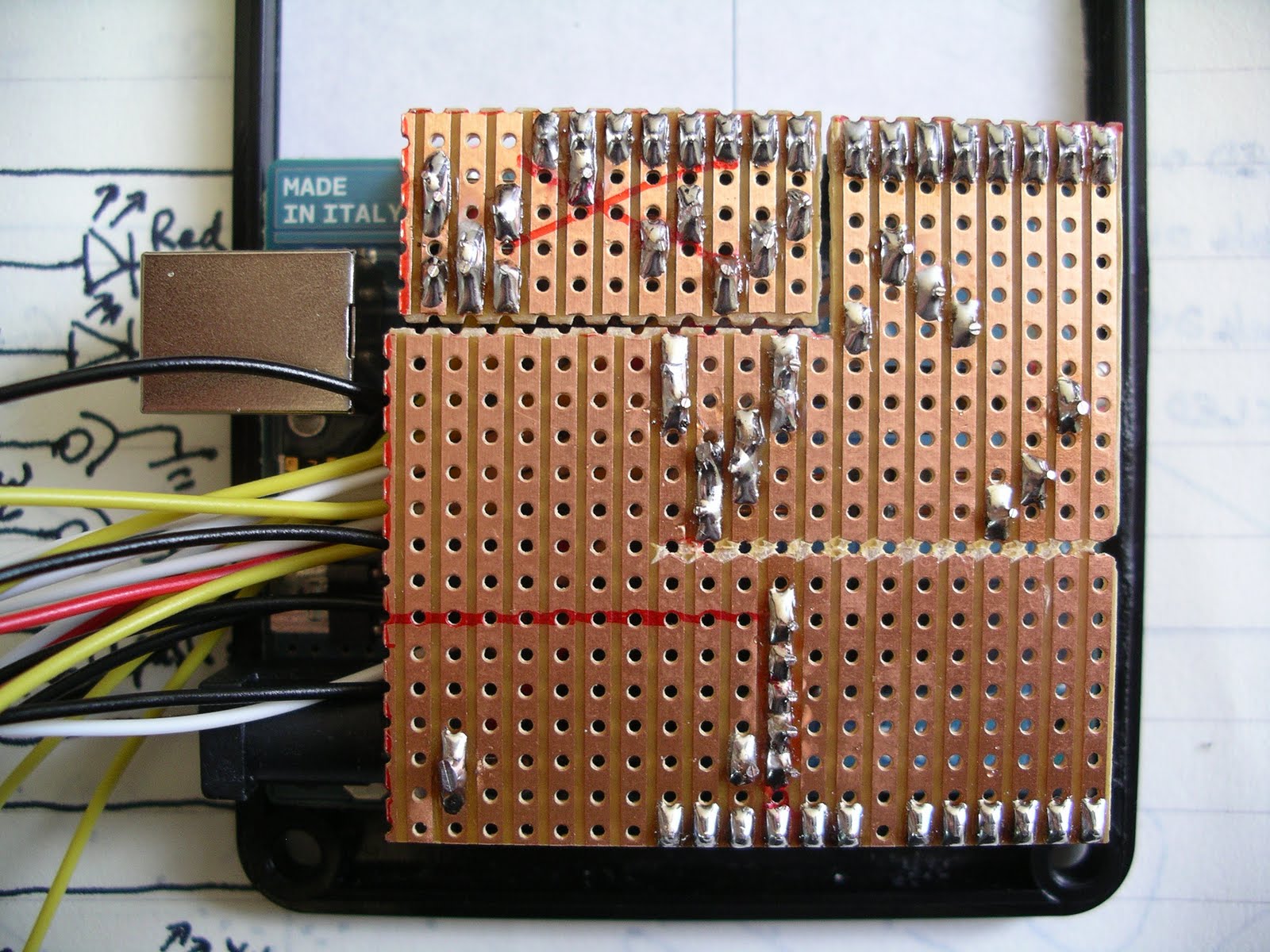 The Veroboard sits on top of the Arduino but has to be in two parts because the pin spacing is non-standard.
