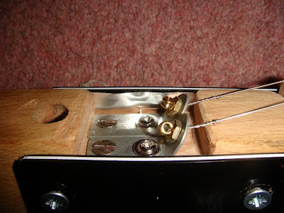 3-ply plastic strips are shielded with foil and connected to ground via the Meccano to reduce hum from the single-coil pickup. With no body to enclose the output jack and volume control, an old die-cast box was fitted to the side.